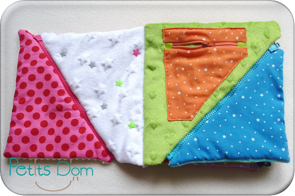 Voilà donc un livre en tissu avec pleins d’activités : 8 FE, des rubans, des poches, des scratch, des pouêt-pouêt, un grelot, des pressions KAM, des paillettes…
