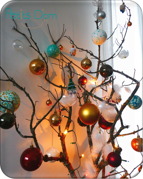 Cela fait 2 années que nous décorons une branche morte d’un arbre de notre jardin. Et au fur et à mesure que les enfants cassent des boules, je les remplace par des décorations home-made.