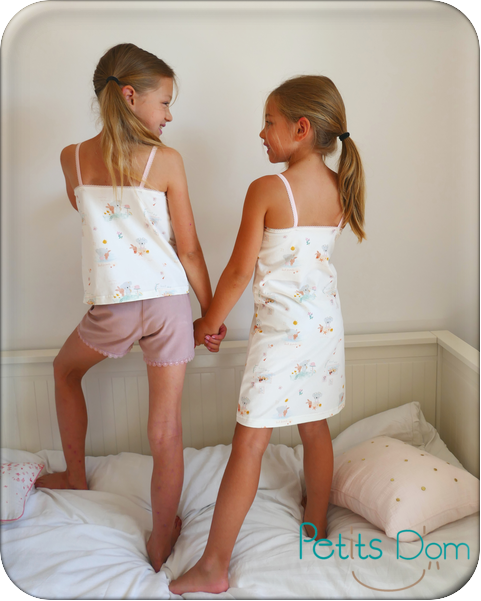 Lise Tailor a eu la gentillesse de m’envoyer un coupon de cet adorable jersey Marcus et Lily que j’ai transformé en débardeur et nuisette pour mes minettes.