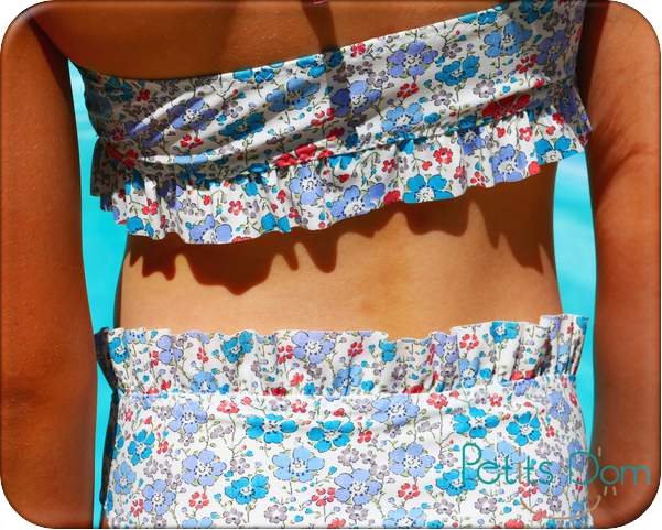 Le fil conducteur de ce modèle est bien sûr les froufrous ! On peut en mettre sur tous les bords du maillot, par exemple sur le haut de la brassière ou du décolleté et à la taille du 2 pièces.