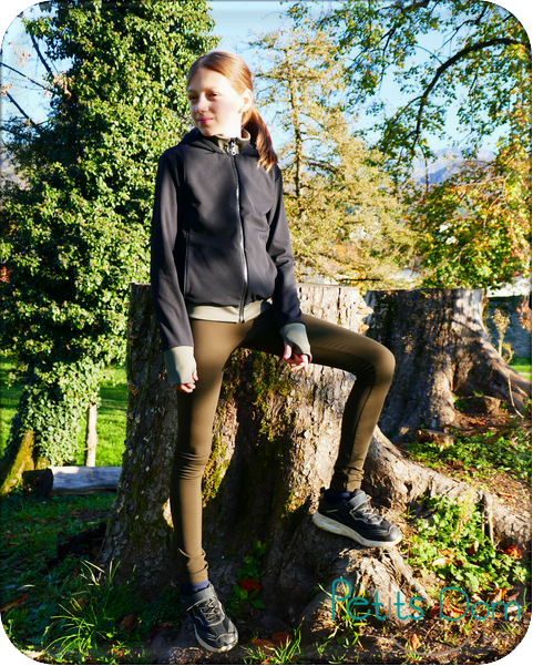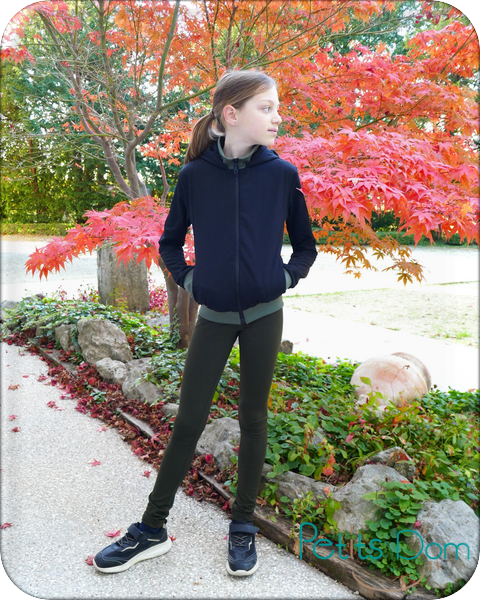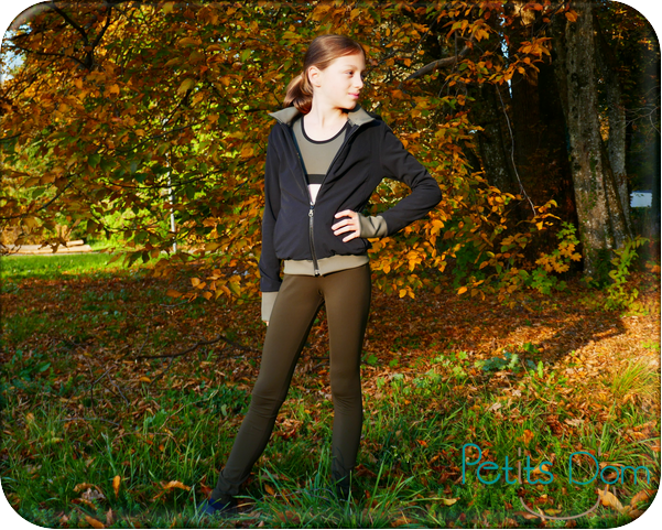 Le tissu utilisé pour le legging est du lycra doublé molleton gratté. Il est mat sur l’endroit et tout doux et chaud sur l’envers, vous pourrez le trouver en 4 coloris (ici c’est le kaki taupé). C’est un tissu bi-stretch avec une bonne élasticité de plus de 60% mais attention il est très gainant avec un fort pouvoir de rétractation. Pour Alice (67 cm de tour de bassin), je couds habituellement le 8 ans mais là j’ai choisi le 10 ans et j’ai bien fait ! Donc pensez bien à surtailler si vous utilisez ce tissu.