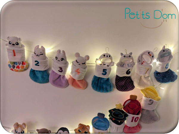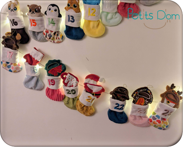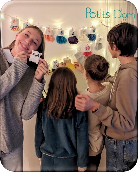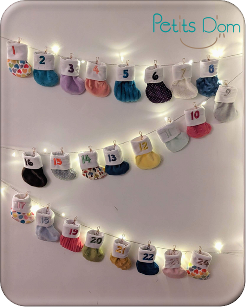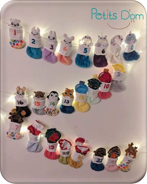 Je suis toujours aussi fan du travail de Choly Knight. Début novembre elle a présenté un calendrier de l’avent adorable sur son compte Instagram. Il y avait un pingouin, j’ai pensé à mon Alice, j’ai craqué ! Je savais que ça allait être compliqué de le réaliser avant Noël car j’étais en pleine préparation des derniers patrons mais j’ai tenté. Fin novembre je n’avais cousu que 2 éléments du calendrier, oups, c’était mal parti… Et puis le 1er décembre, le lendemain du shooting photo, j’ai pris une journée “off”. Enfin disons que je n’ai pas bossé sur les nouveautés, mais j’ai passé la journée à coudre les 24 chaussettes. À 21h elles étaient installées avec la première surprise à découvrir, ouf !