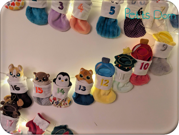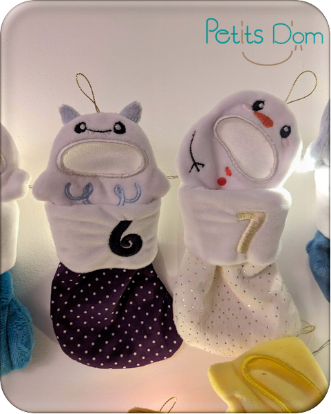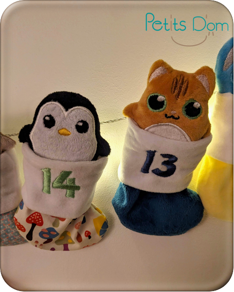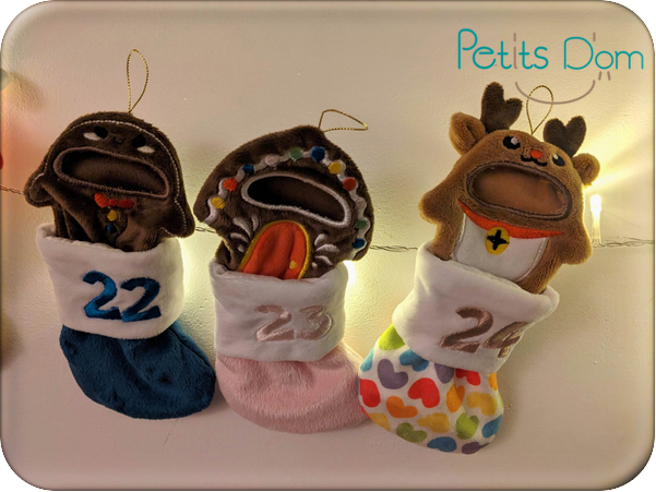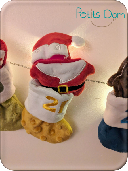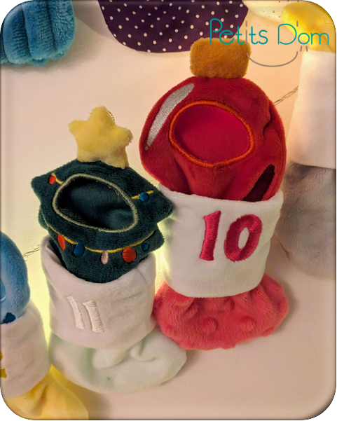 Et puis j’ai cousu régulièrement toutes les autres surprises pour alimenter le calendrier au fur et à mesure, je crois que j’ai fini le 16 décembre (on partait en vacances le 20 !).