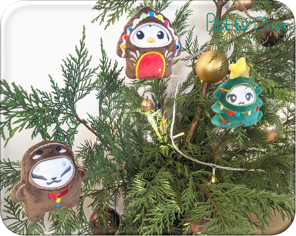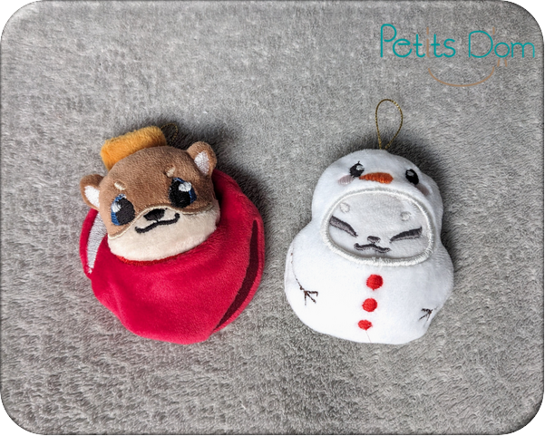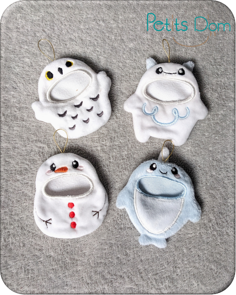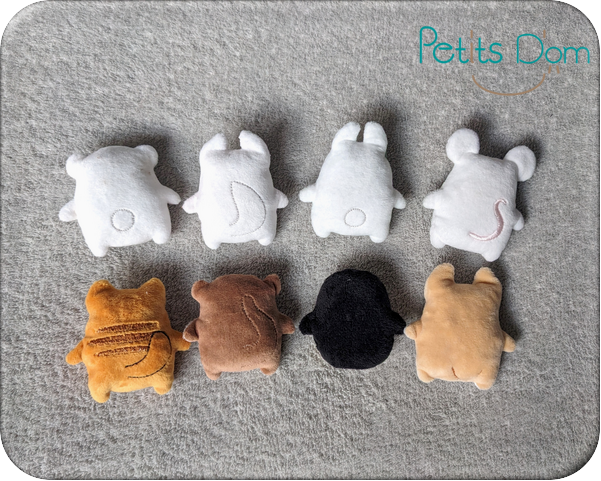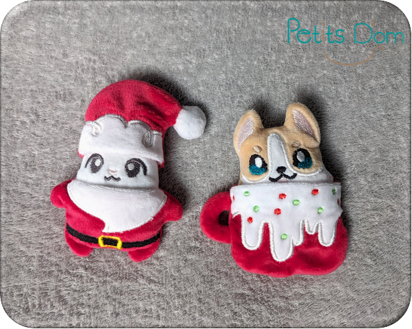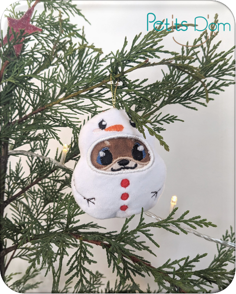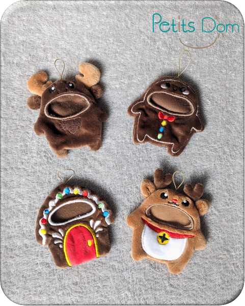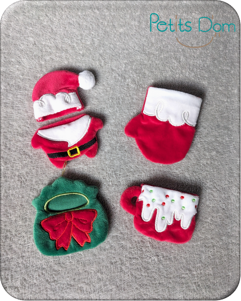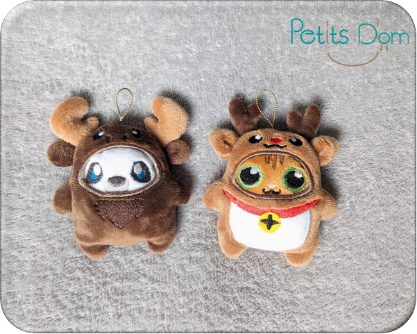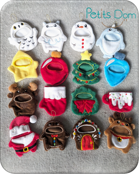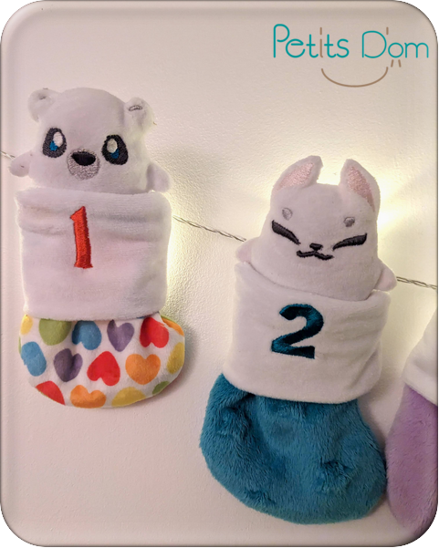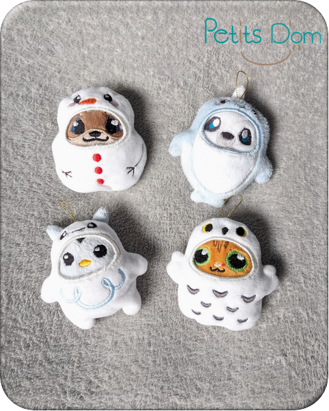 Tous ces éléments sont entièrement réalisés à la brodeuse ! (À part quelques petites pièces à coudre à la main comme les oreilles ou le pompon du bonnet). Donc même la couture d’assemblage du devant et du dos de la peluche ou du costume sont cousus par la brodeuse. Il reste juste à découper autour de la forme, puis de la retourner et la rembourrer si nécessaire.