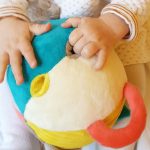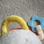 Patron de jouet pour bébé, patron de couture au format PDF : balle d’activité en tissu minkee avec grelot, élément de dentition, anses, trous, nœuds et triangles qui crissent.