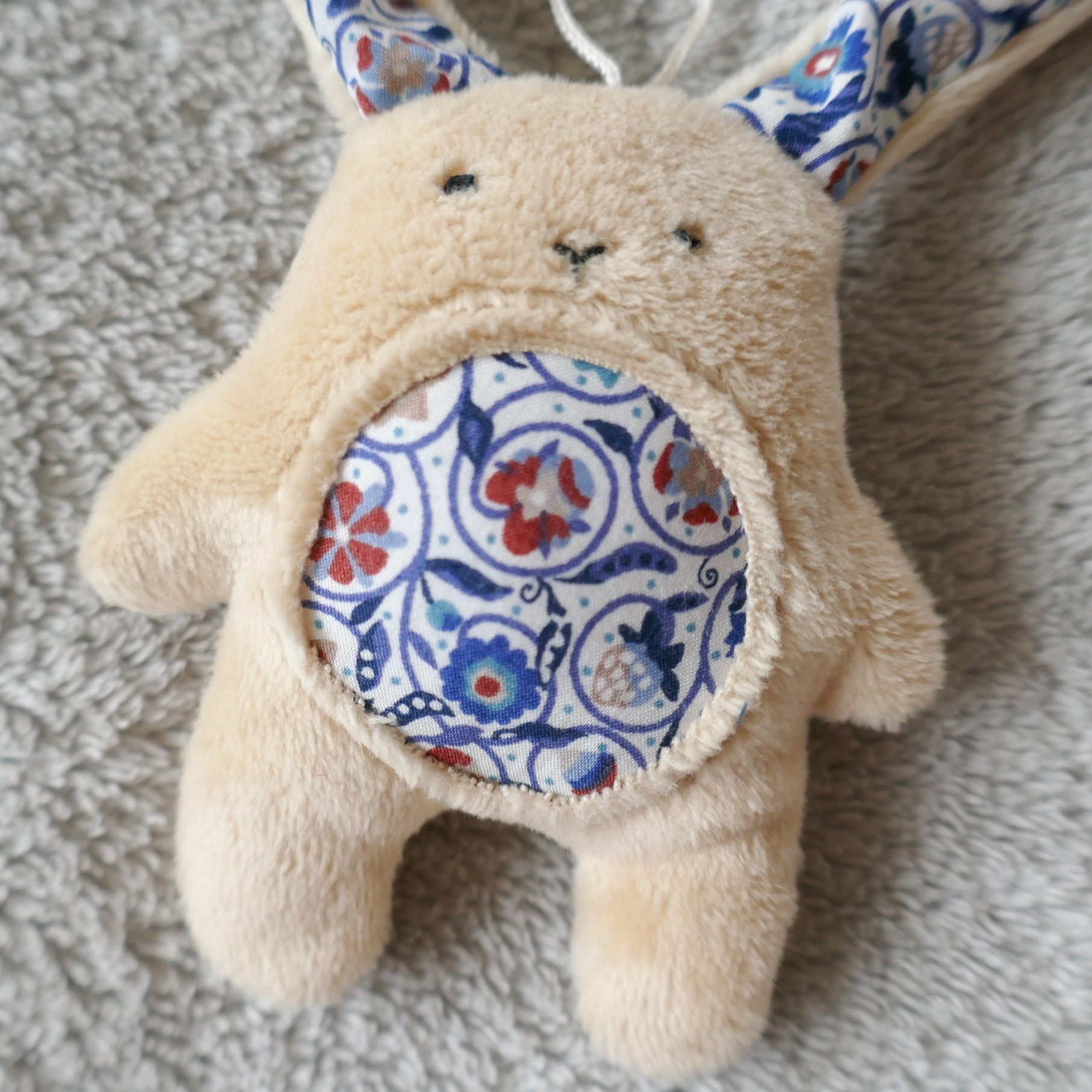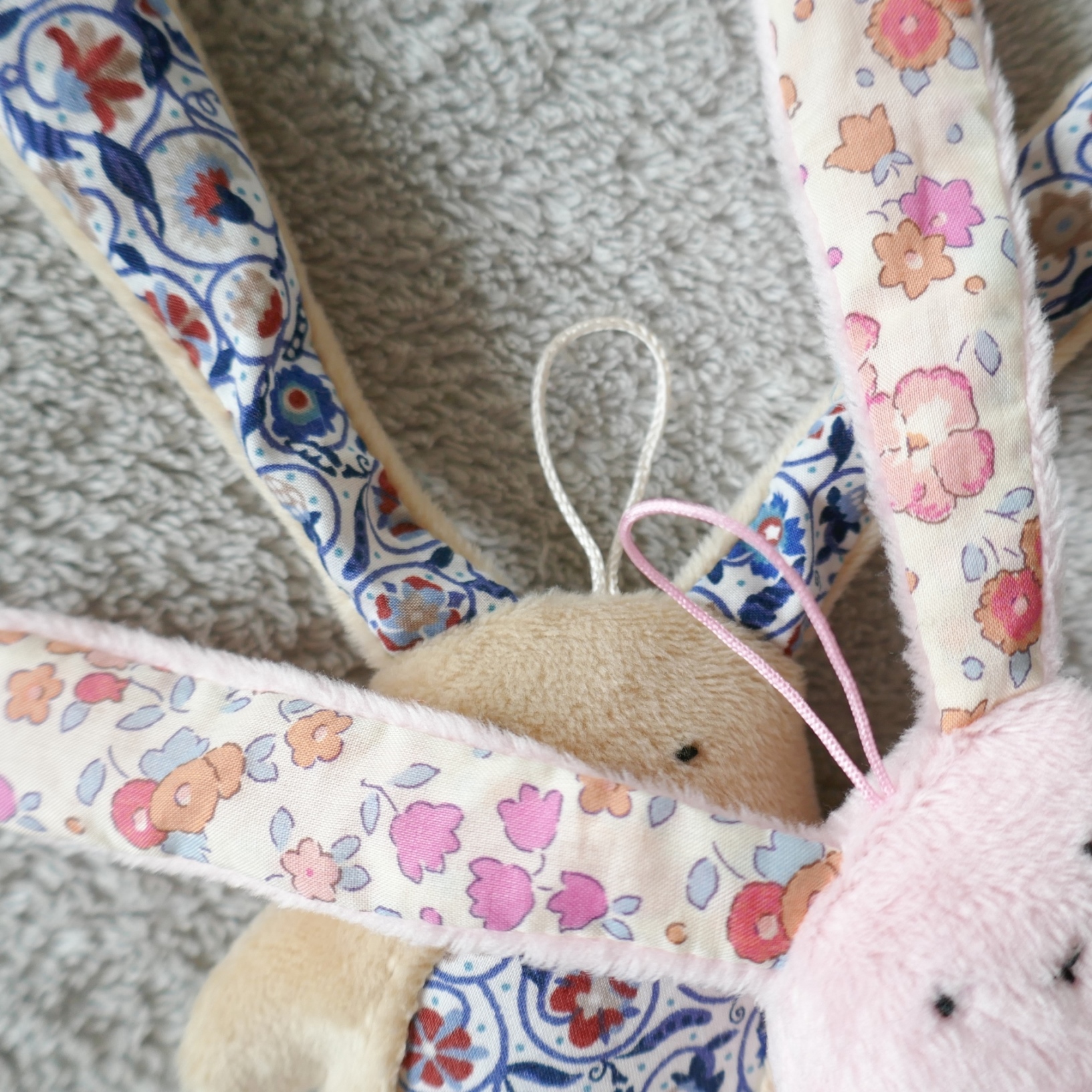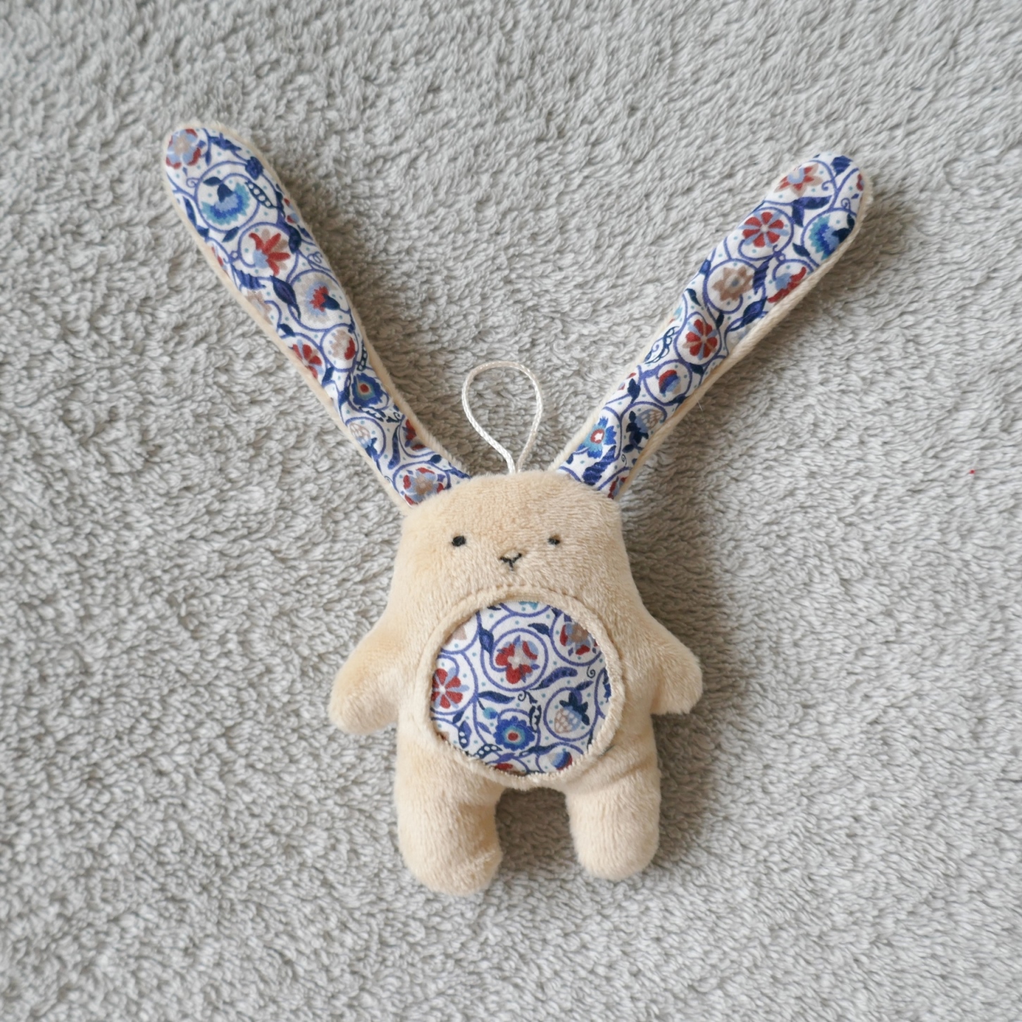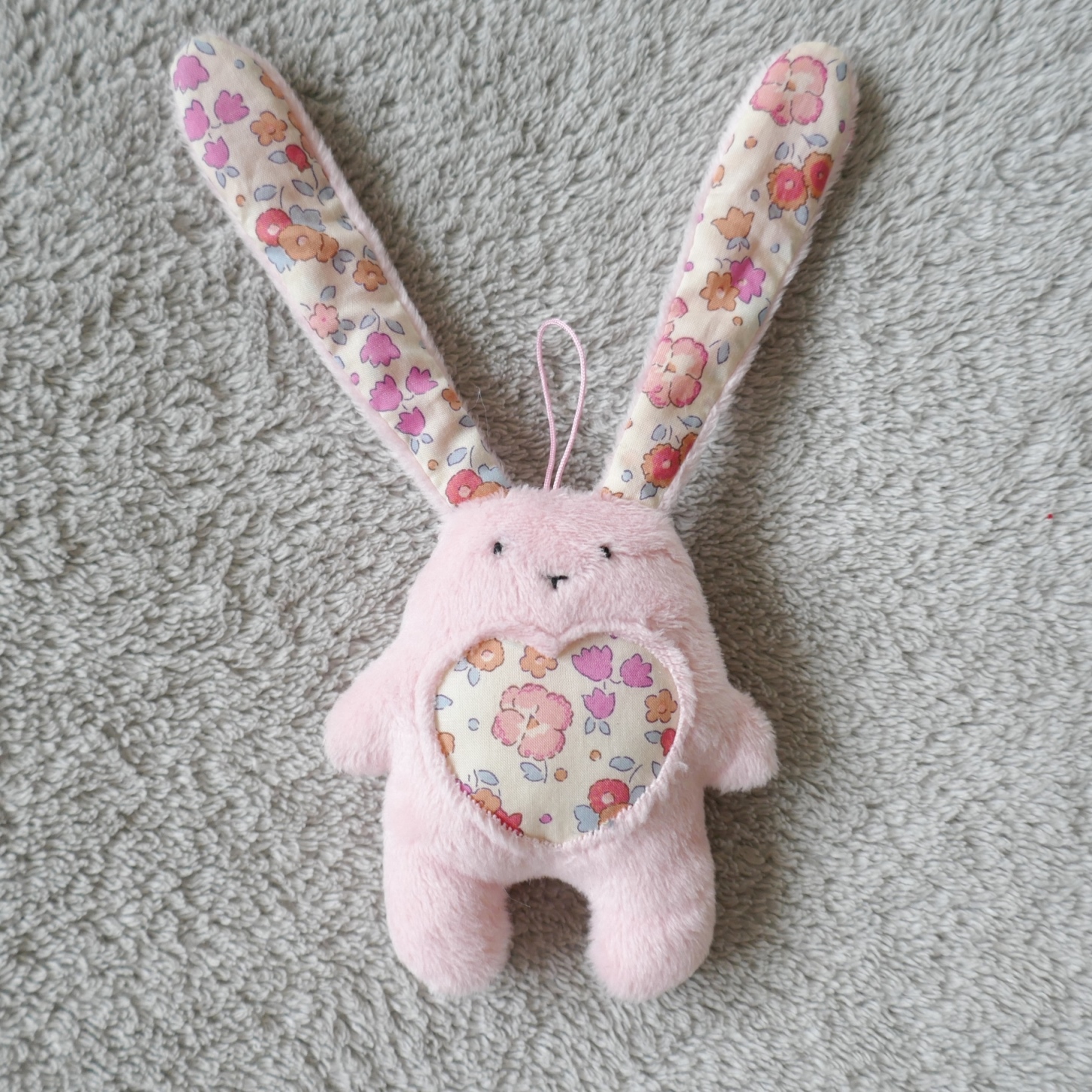 Ce patron de doudou lapin à grandes oreilles est un patron de couture au format PDF : c’est un mini doudou de 8 cm de haut (sans les oreilles), un doudou porte-bonheur à garder près de soi, à accrocher sur son porte-clé ou à suspendre sur une poignet de porte ou encore dans le sapin !