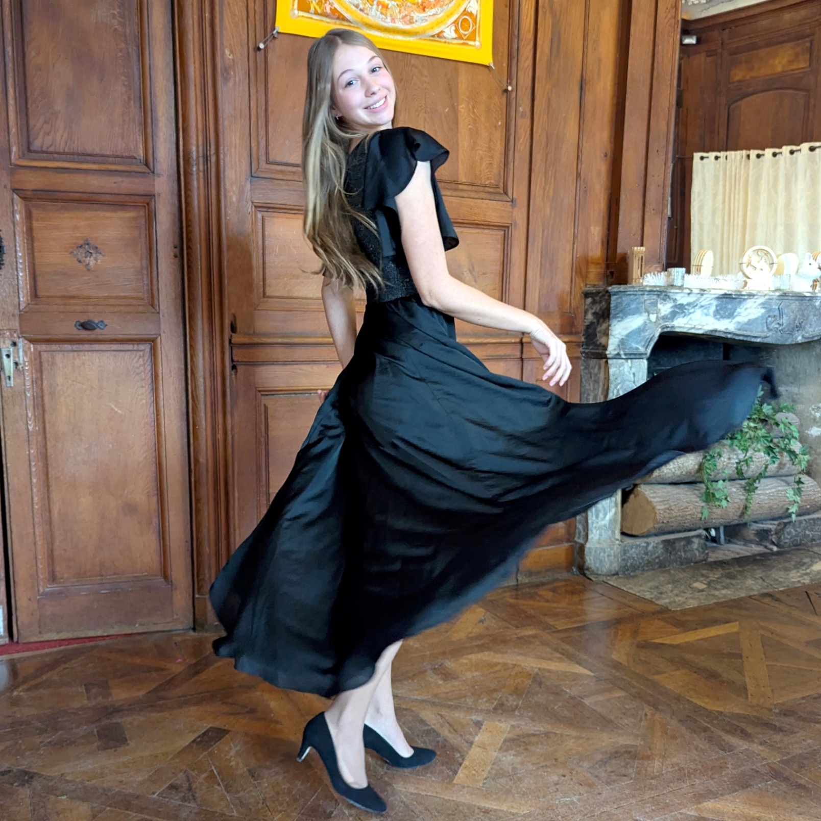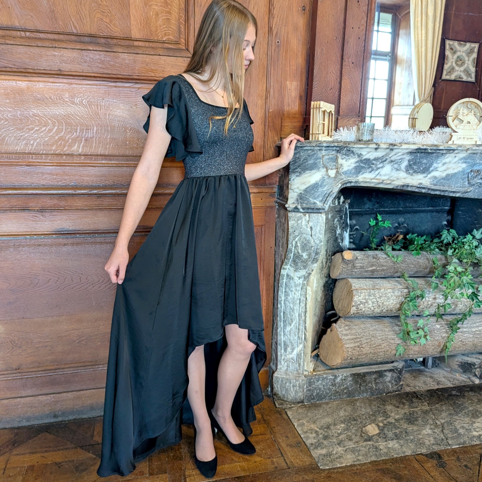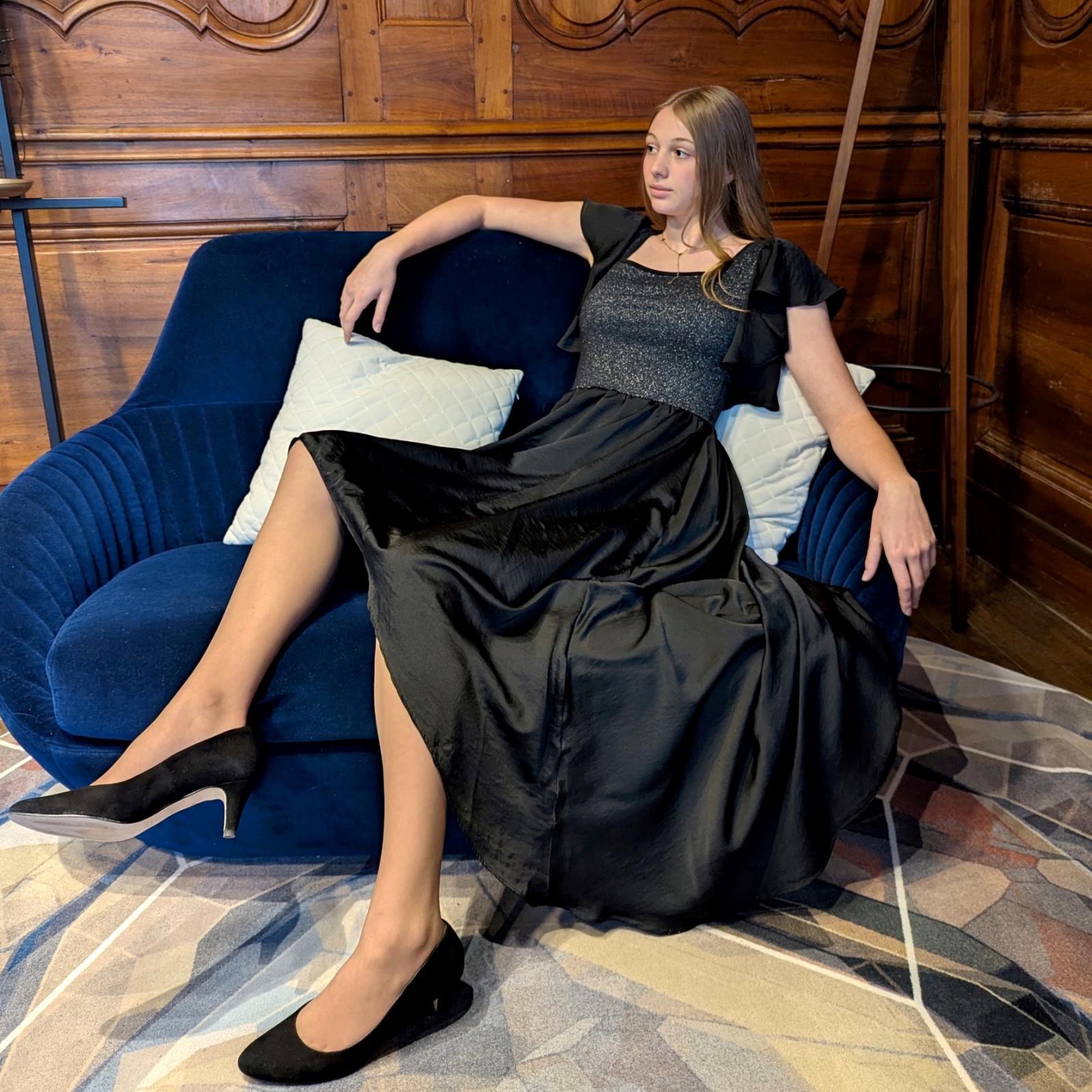 Robe noire : jersey scintillant, crêpe Satin lavé, doublure Venezia