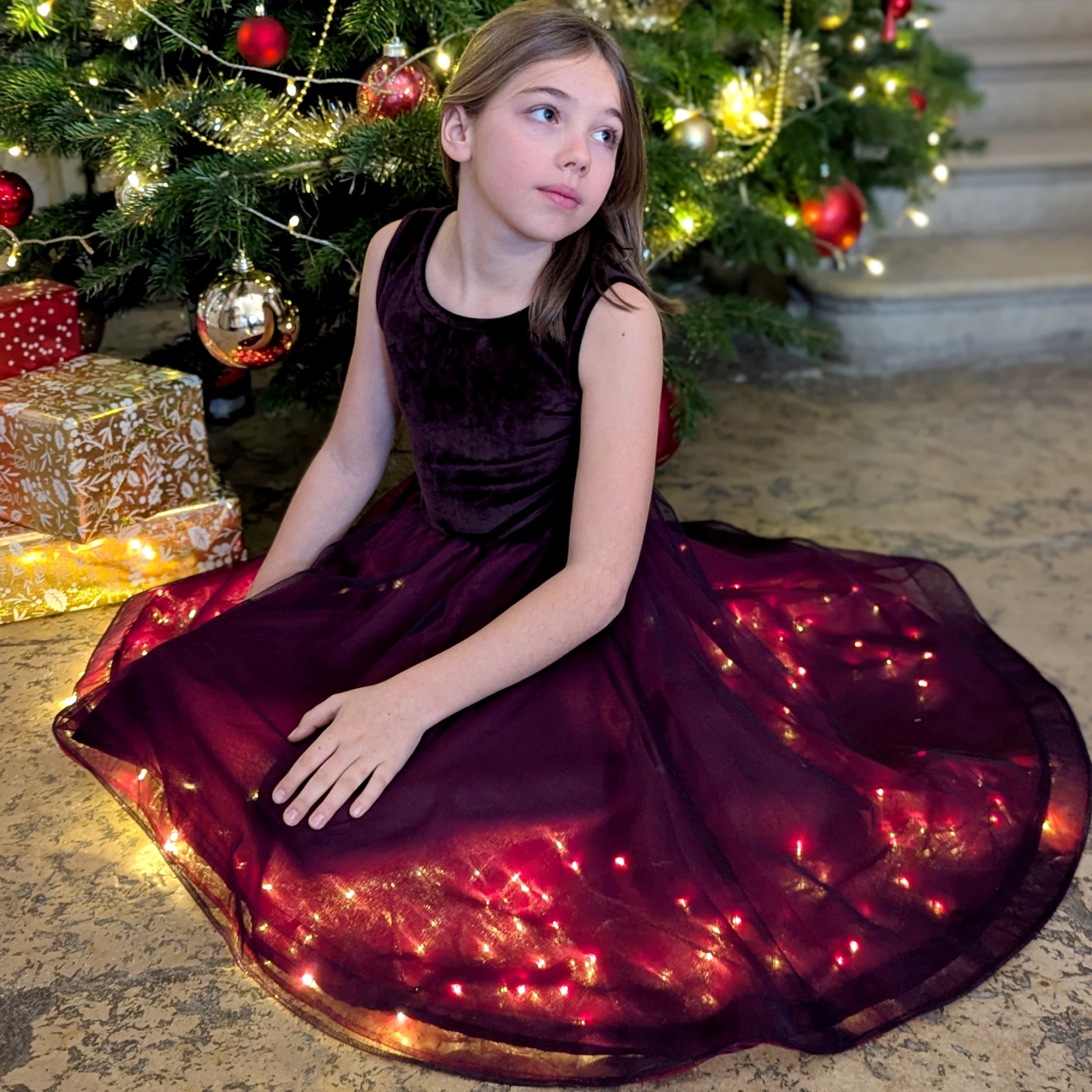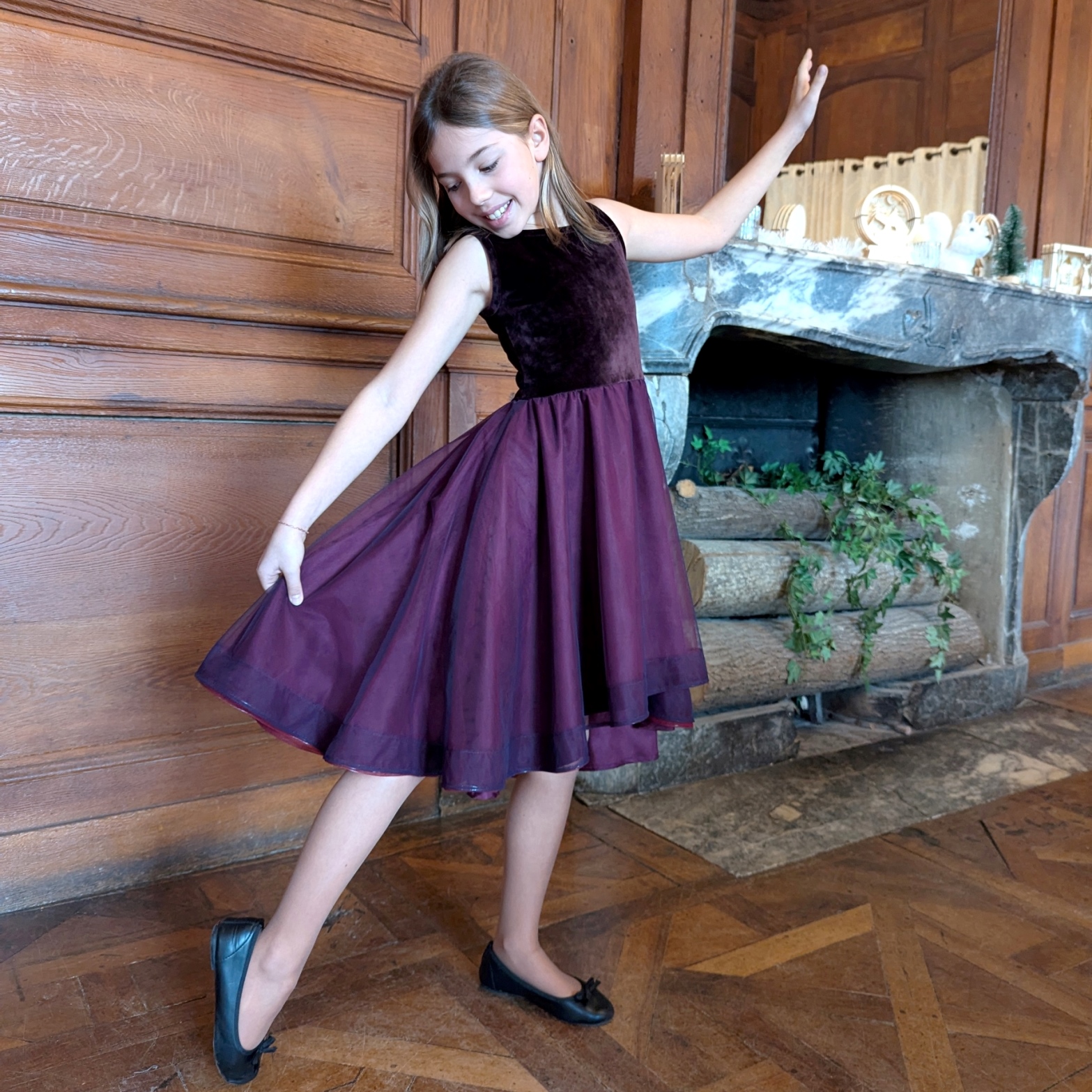 Robe grenat : velours stretch, tulle prune, tulle bordeaux, doublure Venezia